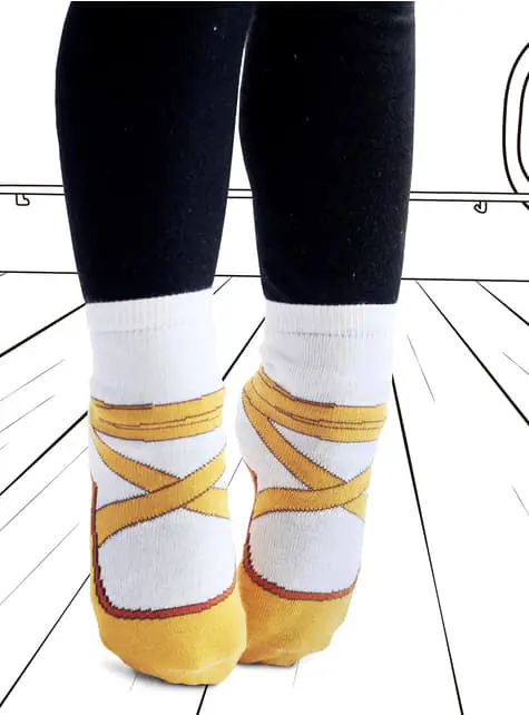 Lieferumfang: Balletschuh-simulierende weiß-gelbe Socken. Das Produkt kommt in einer Geschenk-Metallbox – ideal zum Verschenken
