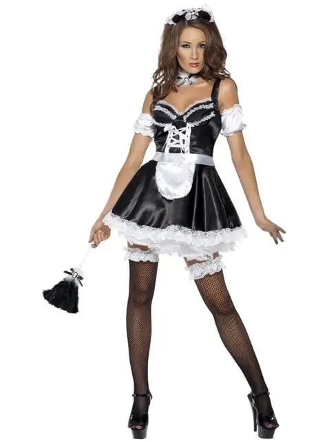 Beinhaltet ein Minikleid eines Dienstmädchens, ein Diadem mit Haube und weiße Ärmel.