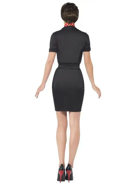 Dieses freche Rizzo Kostüm besteht aus einem schwarzen, eng anliegendem Kleid, einem passenden Gürtel und ein rotes getupftes Halstuch.